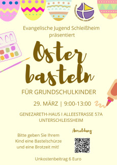 Kommt zu unserem bunten Osterbastelvormittag am 29. März von 9:00 bis 13:00 Uhr im Genezareth-Haus (Alleestraße 57a, Unterschleißheim)!