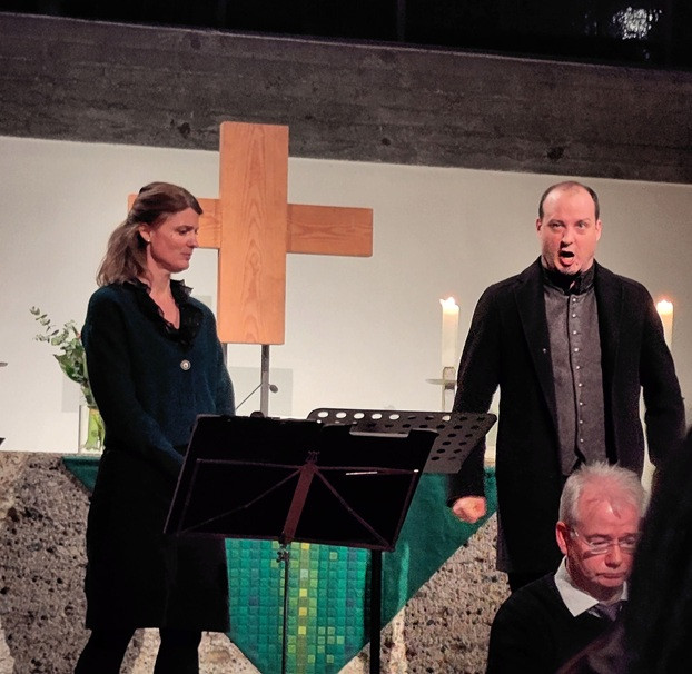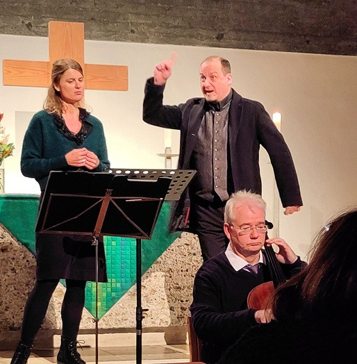 Das Flötenkonzert stellte einen würdigen Auftakt für das Konzert-Highlight, die Kaffeekantate, dar – eine Kantate ganz ohne Chor, dafür mit einer Solistin (Doris Rohe, Sopran) und zwei Solisten (Martin Danes, Bass und Wolfgang Antesberger, Tenor). Rohe sang die Tochter Lieschen, die Kaffee über alles liebt und einer Tasse Kaffee nie widerstehen kann, was ihren Vater Schlendrian (gesungen von Danes) schrecklich erzürnte. Antesberger sang den Erzähler, eine Art Moderator beim heftigen Streit zwischen Vater und Tochter. Vater Schlendrian war richtig außer sich über das Verhalten seiner widerspenstigen Tochter, die immer wieder zu dem gedeckten Tisch neben dem Altar ging, um sich ein Schlückchen Kaffee zu gönnen. Kein Gezeter, keine Drohung – Danes verdrehte die Augen, fuchtelte wild und wollte richtiggehend wüten – beeindruckten Lieschen, die dem Kaffee so verfallen war, dass sie einen echten Lobgesang auf das edle Getränk intonierte. Letztendlich gab Schlendrian auf – zum Glück für Lieschen und auch für ihn selbst. Vor lauter Aufregung hätte er womöglich noch einen Herzinfarkt bekommen! Es kam zu einem versöhnlichen Terzett als harmonisches Ende. Alles in allem ein köstlicher Hörgenuss! Niemand hätte dem Altmeister Bach diesen musikalischen Humor zugetraut, der so ganz anders daherkommt als seine geistigen Kantaten, die ein Zeugnis seiner tiefen Gläubigkeit darstellen.