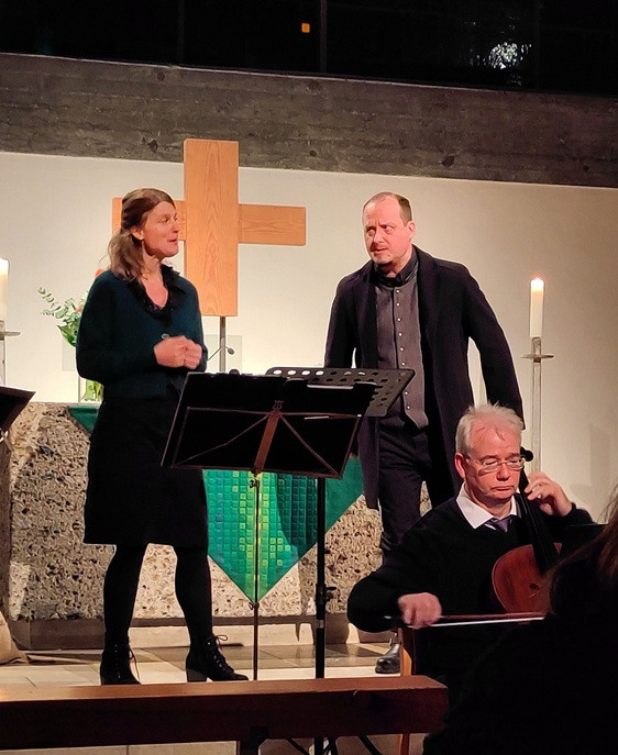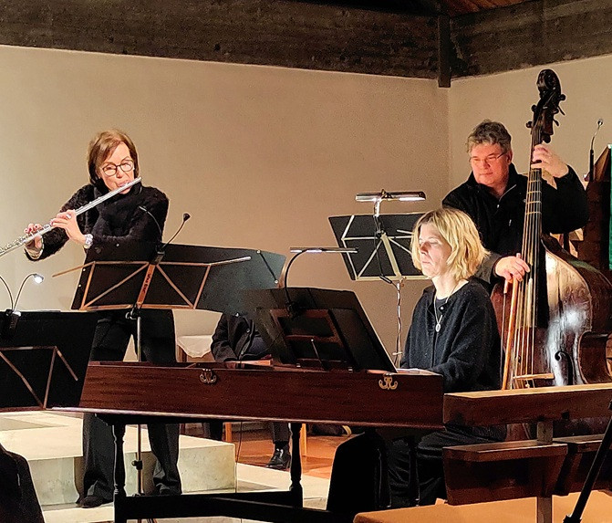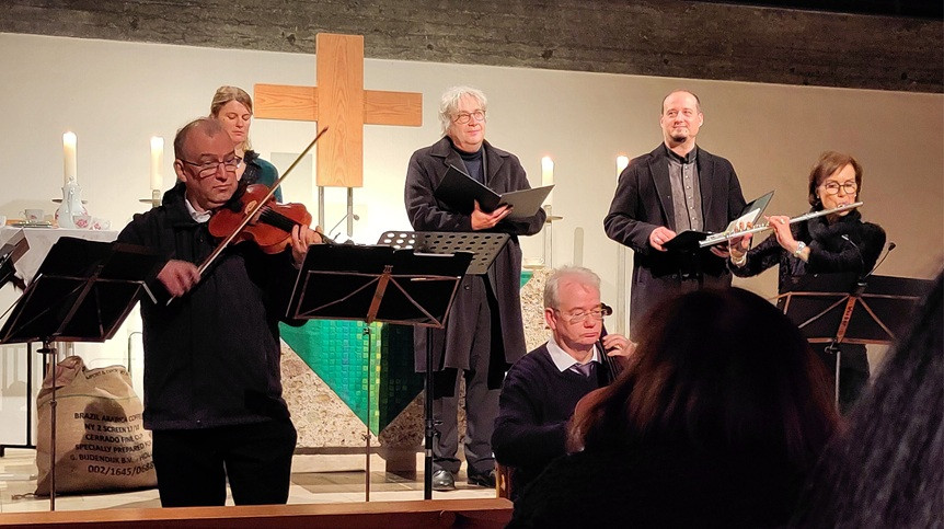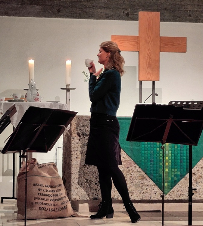 Jetzt im November findet im Raum München das Bachfest 2025 zum diesjährigen Bachjubiläum (340. Geburtstag/275 Todestag) statt. Auch die evang. Trinitatis-Gemeinde Oberschleißheim wollte dazu einen Beitrag leisten und organisierte unter Leitung von Ursula Kaupert (Kirchenmusikerin der Trinitatis-Gemeinde) für Sonntag, den 09. November eine Aufführung der Kaffee-Kantate des großen Meisters. Und das Konzert fand in einem richtig passenden Rahmen nachmittags nach einem fröhlichen Kaffeeklatsch statt! Eine Stunde vor dem eigentlichen Konzertbeginn wurde im Gemeindehaus Kaffee und Kuchen an einer edel und stimmungsvoll gedeckten Tafel serviert. Dass sich an diesem Nachmittag alles um das Thema „Kaffee“ drehen wird, war nicht zu übersehen: Schälchen mit Kaffeebohnen standen zur Dekoration auf den Tischen. An den Wänden hingen Plakate mit Abbildungen von allerhand Dingen, die mit Kaffee in Verbindung standen. Sogar in der Kirche gab es einen Tisch neben dem Altar mit edlem Kaffeegeschirr bestückt, eine wichtige Requisite während der Kaffeekantate. Ja, das Publikum war bestens eingestimmt auf das Konzert, in dem neben der Kaffeekantate noch ein Konzert für Flöte, Streicher und Basso Continuo nach der Flötensonate in A-Dur BWV 1032 (Komponist natürlich ebenfalls Bach) zu Gehör gebracht wurde.